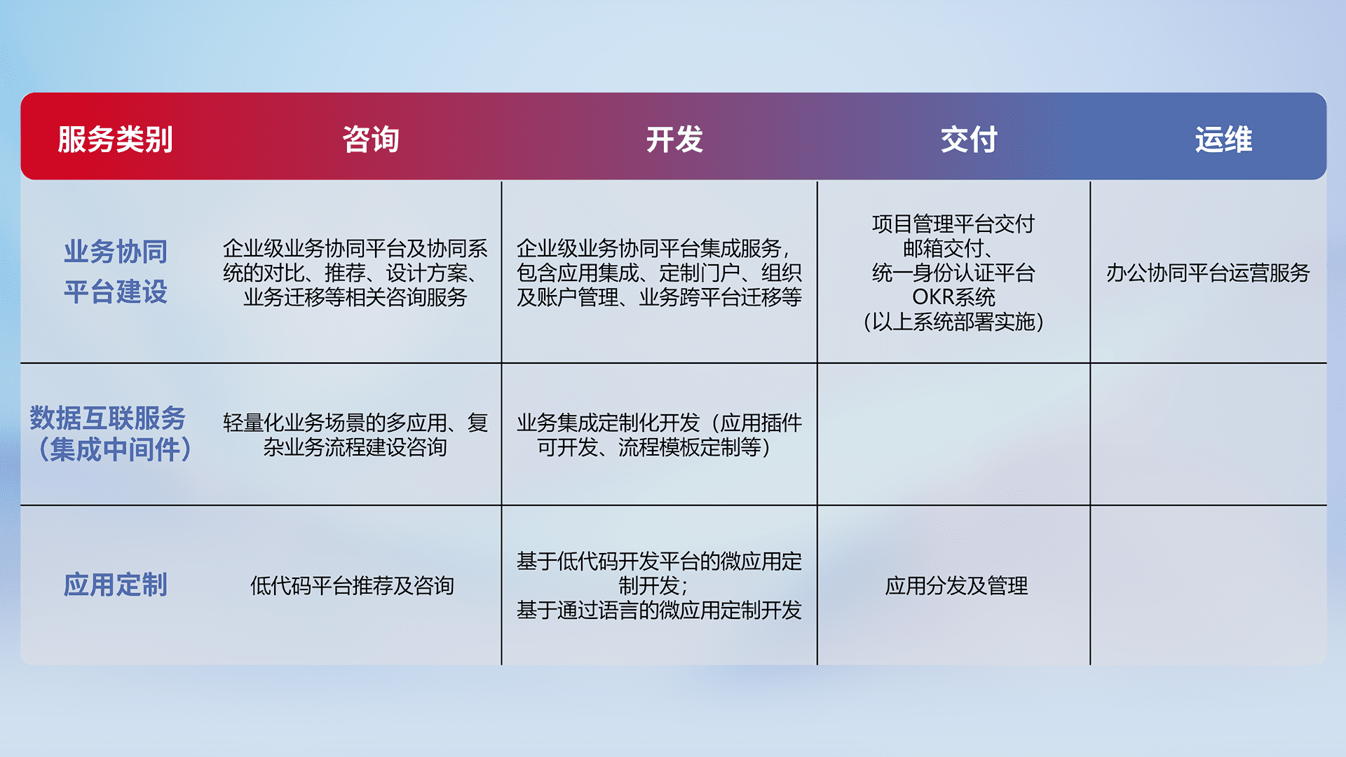 针对钉钉、、企微、、IDaas等平台级产品提供产品的规划、、、、方案、、交付、、、定制化开发等服务,,实现如统一协同办公、、、、智能客户服务、、、混合会议管理、、、、智能数据查询、、等业务场景,,,,实现数字化转型。。